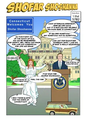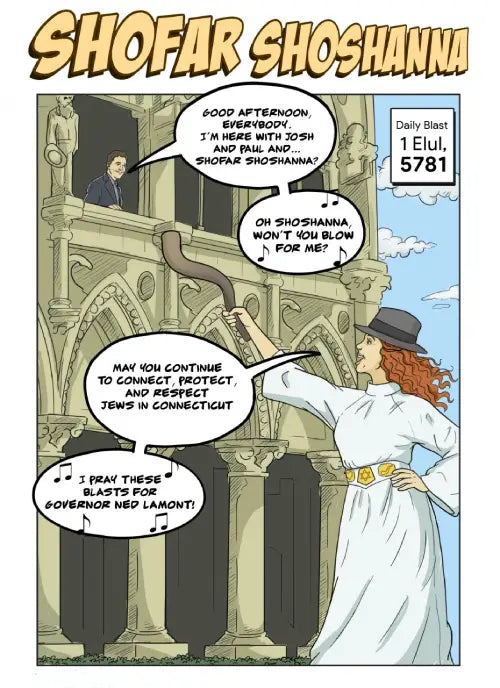 Shofar Shoshanna is the moxie redhead supershero featured in the Daily Blast Comics. Shofar Shoshanna blasts the shofar daily during the month of Elul, a time to soul search, research, and reflect (Take Note! No Notes on Shabbat and Sundays!). The 5785 Tour starts on the tarmac in Connecticut where Shofar Shoshanna meets Paige Bueckers before they board Shofar Shoshanna’s plane! Now they are ready to take off for the LOOK BACK TO GO FORWARD TOUR - there are planes and buses but there’s no leaving the USA. Shofar Shoshanna must stay and pray! LOOK ALIVE in 5785!